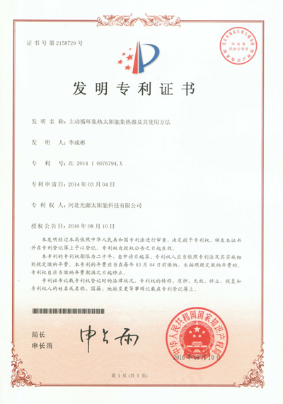 發(fā)明專利證書--主動循環(huán)集熱太陽能集熱器及其使用方法