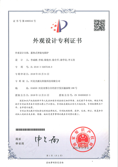 外觀設計專利證書--蓄熱式智能電鍋爐