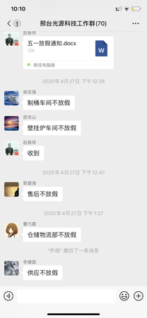 “五.一”前的4月27日,光源太陽(yáng)能科技公司下發(fā)了“五.一”放假的通知。通知說(shuō):“經(jīng)公司領(lǐng)導(dǎo)研究決定,自2020年5月1日——2020年5月5日(“五.一”國(guó)際勞動(dòng)節(jié))放假五天?!?/span>