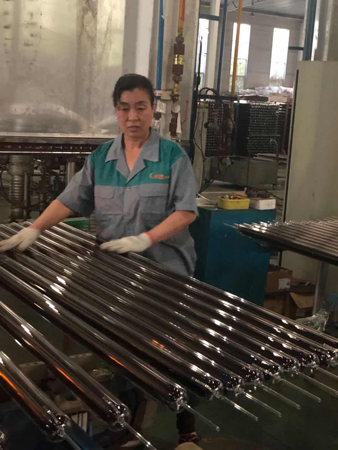 “五.一”這天,驕陽(yáng)似火。室外溫度高達(dá)35度,真空管車間,在火考中作業(yè),工人們揮汗如雨戰(zhàn)高溫。他們的口號(hào)叫得響:寧流萬(wàn)滴汗,不出一次品。