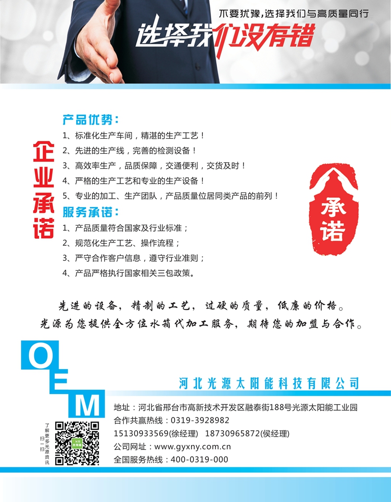 謙尊而光,酌水知源。前行中的光源太陽能,感恩客戶,固本創(chuàng)新,以振興民族太陽能光熱產(chǎn)業(yè)為己任,將“打造太陽能世界品牌”作為企業(yè)發(fā)展目標(biāo),高歌奮進,光耀東方!