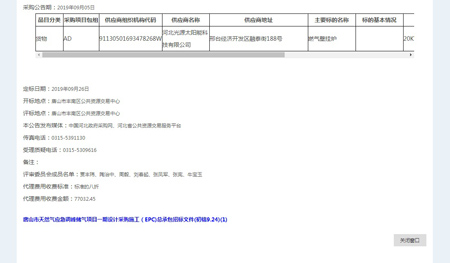 奮力拼搏創(chuàng)佳績,捷報(bào)頻傳奏凱歌。河北光源太陽能科技有限公司,在2019年09月27日,唐山市豐南區(qū)2019年第二批氣代煤燃?xì)獗趻鞝t及電代煤電取暖設(shè)備采購及安裝項(xiàng)目A標(biāo)包第四標(biāo)段中標(biāo),為我公司2019年度輝煌的經(jīng)營業(yè)績再添濃墨重彩的一筆。